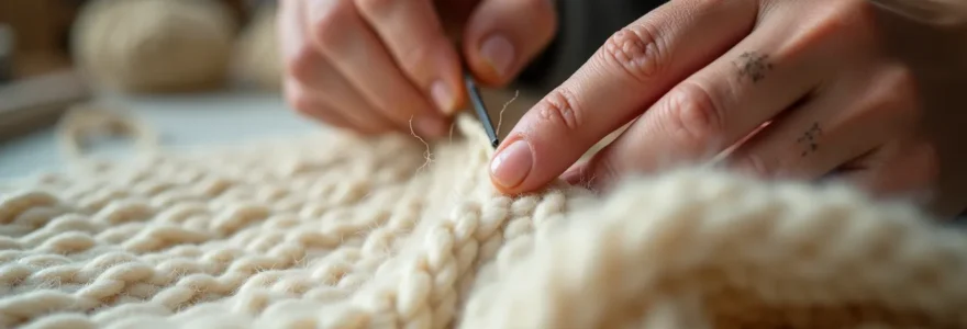 Le remaillage manuel, visible sur les mains de l’artisan, représente l’une des finitions les plus exigeantes. Cette technique consiste à fermer les dernières mailles d’un vêtement en les cousant une à une avec une aiguille spéciale, créant une jonction invisible. Un bon remailleur peut passer 20 minutes sur une seule encolure pour garantir une finition imperceptible au toucher.
